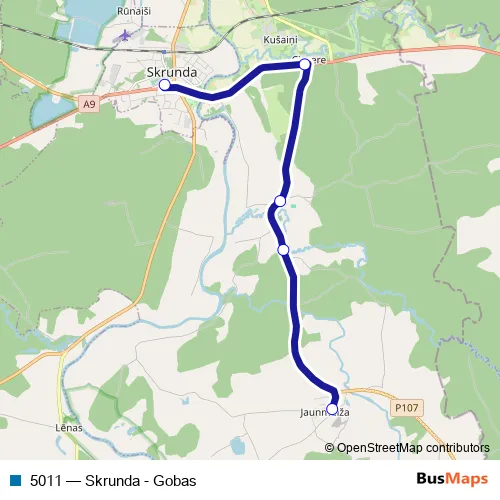 The first stop of the 5011 bus route is Skrundas Ao and the last stop is Jaunmuižas skola. 5011 (Skrunda - Gobas) is operational during по будням.