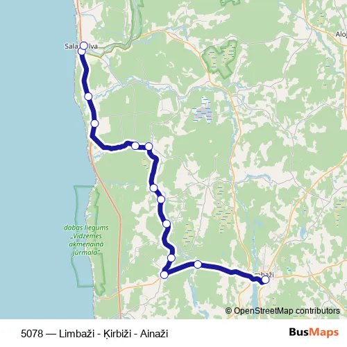 The first stop of the 5078 bus route is Limbažu Ao and the last stop is Salacgrīva. 5078 (Limbaži - Ķirbiži - Ainaži) is operational during ежедневно.