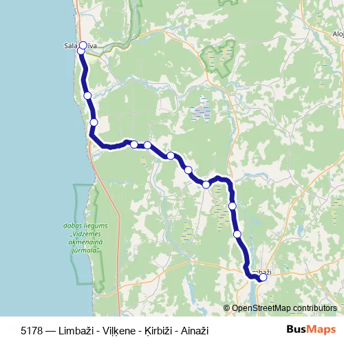 The first stop of the 5178 bus route is Limbažu Ao and the last stop is Salacgrīva. 5178 (Limbaži - Viļķene - Ķirbiži - Ainaži) is operational during ежедневно.