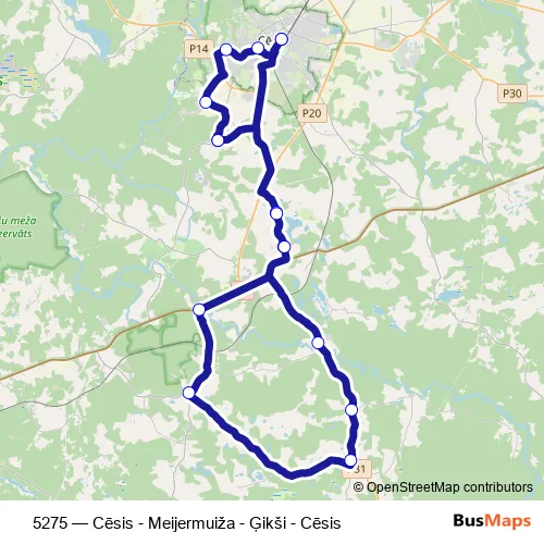 The first stop of the 5275 bus route is Cēsu Ao and the last stop is Cēsu Ao. 5275 (Cēsis - Meijermuiža - Ģikši - Cēsis) is operational during по будням.