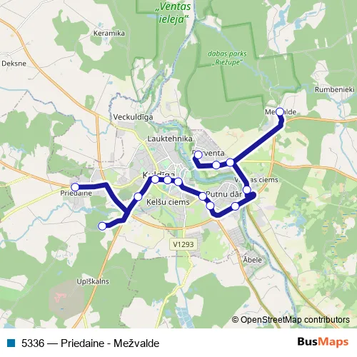 The first stop of the 5336 bus route is Kuldīgas Ao and the last stop is Kuldīgas Ao. 5336 (Priedaine - Mežvalde) is operational during ежедневно.