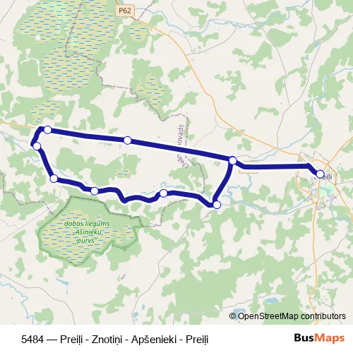 The first stop of the 5484 bus route is Preiļu Ao and the last stop is Preiļu Ao. 5484 (Preiļi - Znotiņi - Apšenieki - Preiļi) is operational during ежедневно.