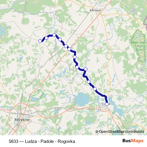 The first stop of the 5633 bus route is Ludzas Ao and the last stop is Rogovka. 5633 (Ludza - Padole - Rogovka) is operational during ежедневно.