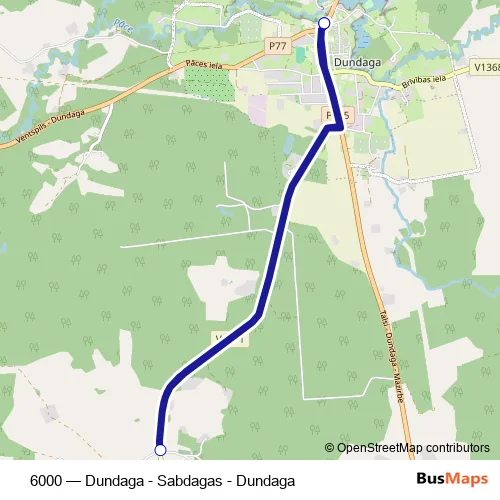 The first stop of the 6000 bus route is Dundaga and the last stop is Dundaga. 6000 (Dundaga - Sabdagas - Dundaga) is operational during по будням.
