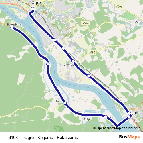 The first stop of the 6108 bus route is Bekuciems and the last stop is Ogres Ao. 6108 (Ogre - Ķegums - Bekuciems) is operational during ежедневно.