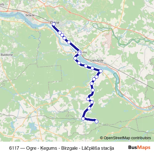 The first stop of the 6117 bus route is Ogres Ao and the last stop is Lāčplēša stacija. 6117 (Ogre - Ķegums - Birzgale - Lāčplēša stacija) is operational during ежедневно.