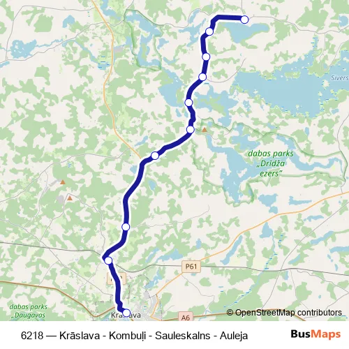 The first stop of the 6218 bus route is Krāslavas Ao and the last stop is Auleja. 6218 (Krāslava - Kombuļi - Sauleskalns - Auleja) is operational during ежедневно.