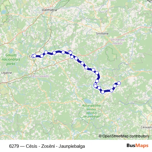 The first stop of the 6279 bus route is Cēsu Ao and the last stop is Jaunpiebalga. 6279 (Cēsis - Zosēni - Jaunpiebalga) is operational during ежедневно.