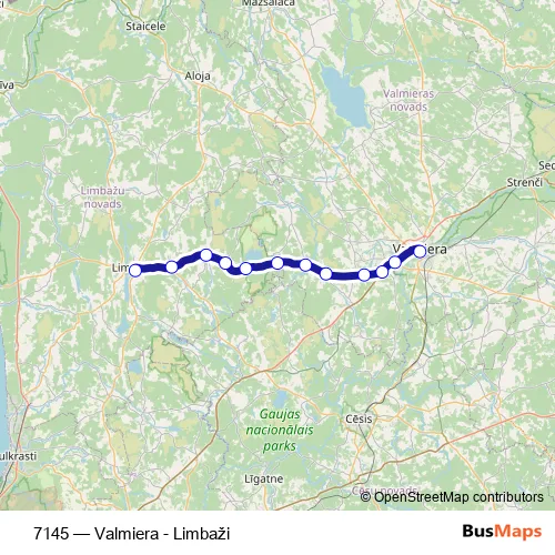 The first stop of the 7145 bus route is Valmieras Ao and the last stop is Limbažu Ao. 7145 (Valmiera - Limbaži) is operational during ежедневно.