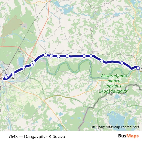 The first stop of the 7543 bus route is Daugavpils Ao and the last stop is Krāslavas Ao. 7543 (Daugavpils - Krāslava) is operational during ежедневно.
