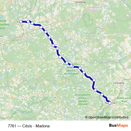 The first stop of the 7761 bus route is Madonas Ao and the last stop is Cēsu Ao. 7761 (Cēsis - Madona) is operational during ежедневно.