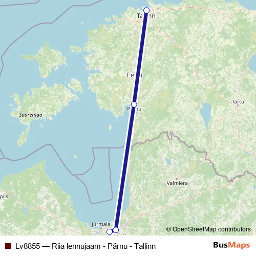 The first stop of the Lv8855 bus route is Tallinna bussijaam and the last stop is Riia lennujaam. Lv8855 (Riia lennujaam - Pärnu - Tallinn) is operational during ежедневно.