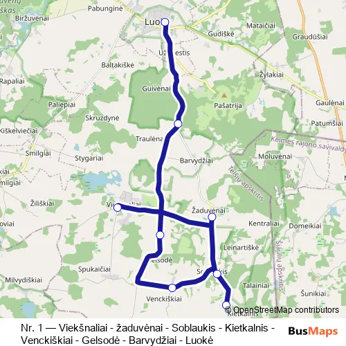 The first stop of the Nr. 1 bus route is Viekšnaliai and the last stop is Luokė. Nr. 1 (Viekšnaliai - žaduvėnai - Soblaukis - Kietkalnis - Venckiškiai - Gelsodė - Barvydžiai - Luokė) is operational during по будням.