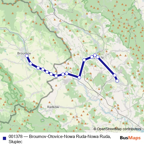 The first stop of the 001378 bus route is Broumov,žel.st. and the last stop is Nowa Ruda,Słupiec,Intermarche. 001378 (Broumov-Otovice-Nowa Ruda-Nowa Ruda,Słupiec) is operational during по выходным.