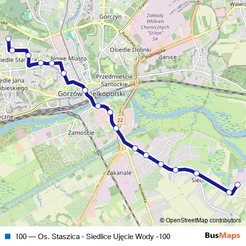 The first stop of the 100 bus route is Siedlice Ujęcie Wody and the last stop is Os. Staszica. 100 (Os. Staszica - Siedlice Ujęcie Wody -100) is operational during ежедневно.