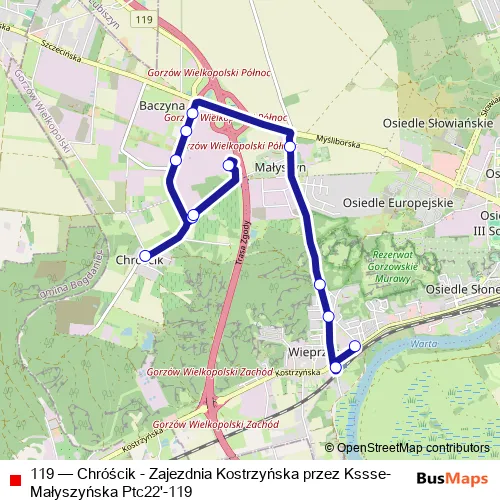 The first stop of the 119 bus route is Chróścik and the last stop is Zajezdnia Kostrzyńska. 119 (Chróścik - Zajezdnia Kostrzyńska przez Kssse-Małyszyńska Ptc22'-119) is operational during ежедневно.