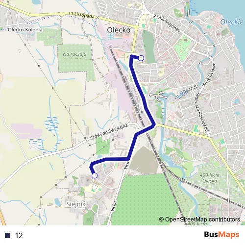 The first stop of the 12 bus route is Baza Faster and the last stop is Olecko, Osiedle Siejnik. 12 is operational during по будням.