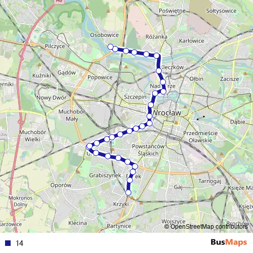 The first stop of the 14 tram route is Krzyki and the last stop is Osobowice. 14 is operational during ежедневно.