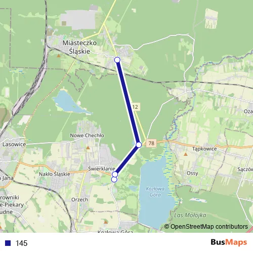 The first stop of the 145 bus route is Świerklaniec Park and the last stop is Żyglin Kościół. 145 is operational during ежедневно.