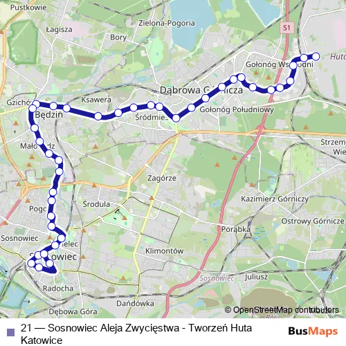 Sosnowiec Aleja Zwycięstwa. 21 (Sosnowiec Aleja Zwycięstwa - Tworzeń Huta Katowice) is operational during ежедневно.