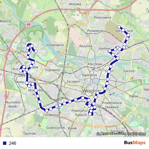 See why over 2 million users trust and consider busmaps.com as the best public transport website. busmaps gives you Wroclaw Buses suggested routes, real-time bus tracker, line route maps in Wroclaw, and helps to find the closest 246 bus stops near you. No internet available? Download an offline PDF map and bus schedule for the 246 bus to take on your trip.