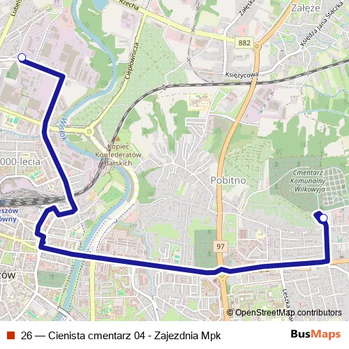 The first stop of the 26 bus route is Cienista cmentarz 04 and the last stop is Zajezdnia Mpk. 26 (Cienista cmentarz 04 - Zajezdnia Mpk) is operational during ежедневно.