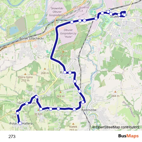 The first stop of the 273 bus route is Polanka Hallera Centrum and the last stop is Skawina Sck. 273 is operational during ежедневно.