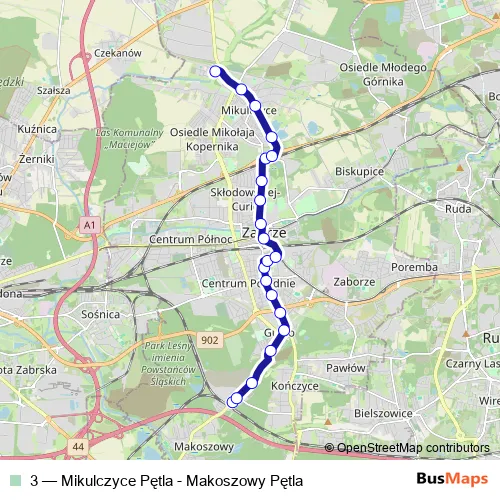 The first stop of the 3 tram route is Makoszowy Pętla and the last stop is Mikulczyce Pętla. 3 (Mikulczyce Pętla - Makoszowy Pętla) is operational during ежедневно.