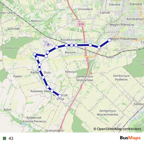 The first stop of the 43 bus route is Węglin Wróbla and the last stop is Radawczyk Drugi - szkoła. 43 is operational during по будням.