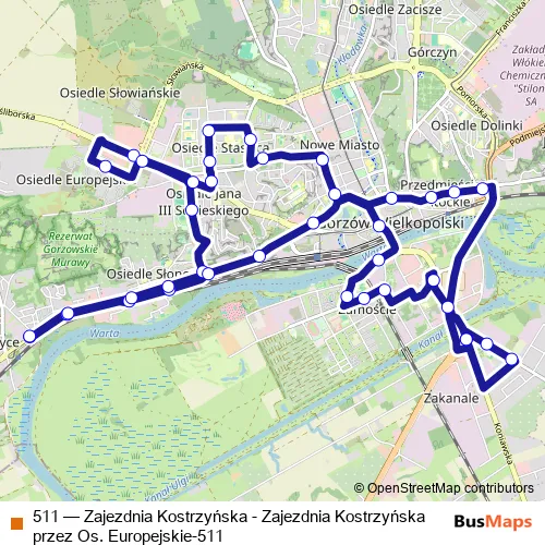 Click here to view the nearest 511 - Zajezdnia Kostrzyńska - Zajezdnia Kostrzyńska przez Os. Europejskie-511 bus stop.