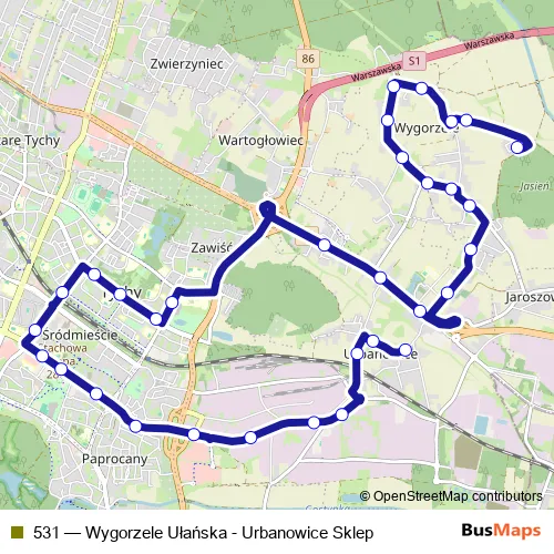 The first stop of the 531 bus route is Wygorzele Ułańska and the last stop is Urbanowice Sklep. 531 (Wygorzele Ułańska - Urbanowice Sklep) is operational during ежедневно.