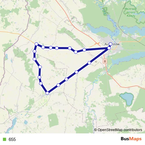 The first stop of the 655 bus route is Augustów D.A. and the last stop is Augustów D.A.. 655 is operational during по будням.