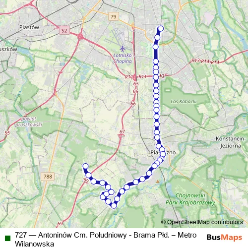 The first stop of the 727 bus route is Metro Wilanowska and the last stop is Władysławów. 727 (Antoninów Cm. Południowy - Brama Płd. – Metro Wilanowska) is operational during ежедневно.