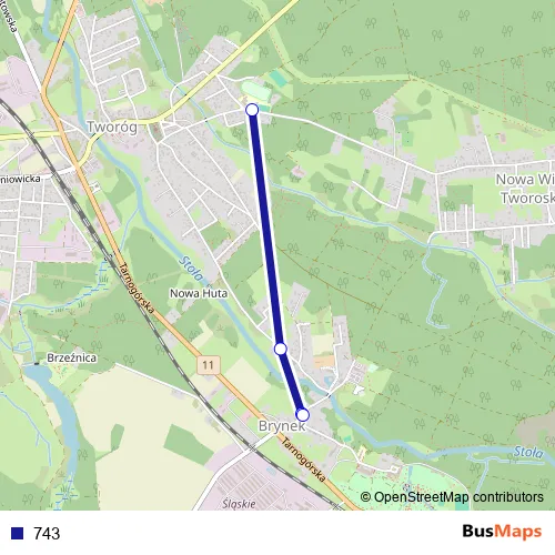 The first stop of the 743 bus route is Tworóg Szkoła and the last stop is Brynek Zamkowa. 743 is operational during по будням.