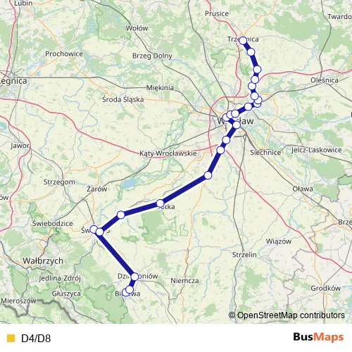 The first stop of the D4/D8 rail route is Bielawa Zachodnia and the last stop is Trzebnica. D4/D8 is operational during ежедневно.