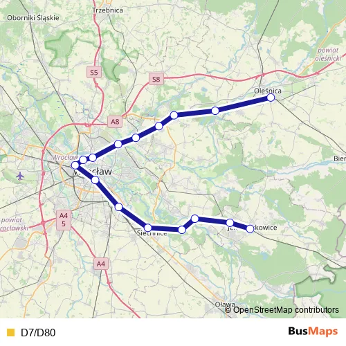 The first stop of the D7/D80 rail route is Jelcz-Laskowice and the last stop is Oleśnica. D7/D80 is operational during по будням.