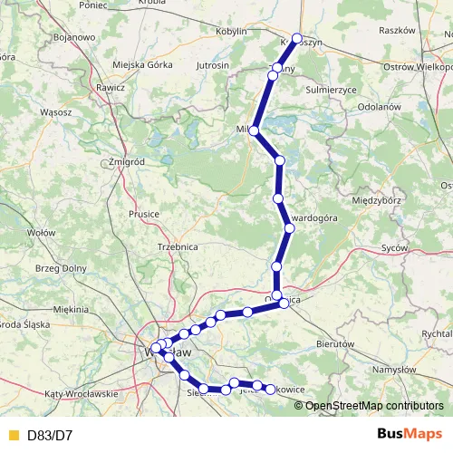 See why over 2 million users trust and consider busmaps.com as the best public transport website. busmaps gives you Wroclaw Rail Services suggested routes, real-time bus tracker, line route maps in Wroclaw, and helps to find the closest D83/D7 rail stops near you. No internet available? Download an offline PDF map and bus schedule for the D83/D7 rail to take on your trip.