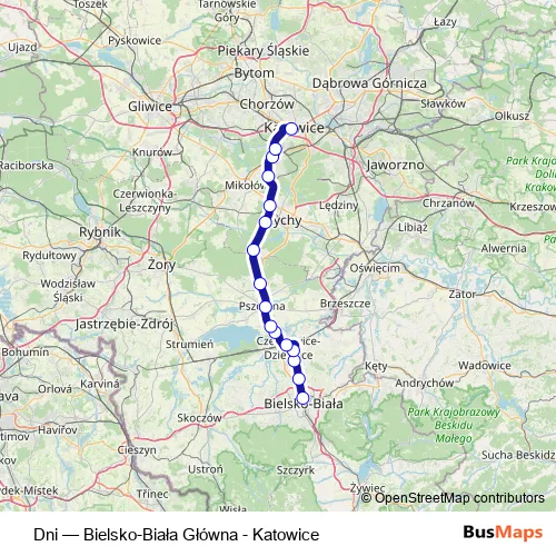 The first stop of the Dni rail route is Bielsko-Biała Gł. and the last stop is Katowice. Dni (Bielsko-Biała Główna - Katowice) is operational during по выходным.