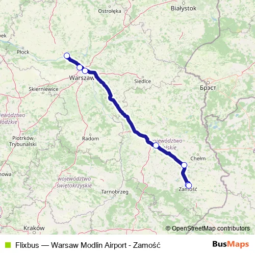 The first stop of the Flixbus bus route is Warsaw Modlin Airport Arrivals Terminal and the last stop is Zamosc Lwowska. Flixbus (Warsaw Modlin Airport - Zamość) is operational during ежедневно.