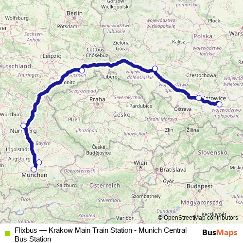The first stop of the Flixbus bus route is Krakow Central Bus Station and the last stop is Munich Central Bus Station. Flixbus (Krakow Main Train Station - Munich Central Bus Station) is operational during ежедневно.