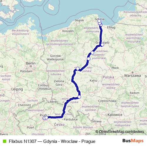 The first stop of the Flixbus N1307 bus route is Prague (Central Bus Station Florenc) and the last stop is Gdynia, Bus station. Flixbus N1307 (Gdynia - Wroclaw - Prague) is operational during ежедневно.