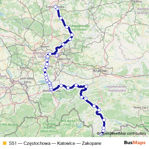 The first stop of the S51 rail route is Zakopane and the last stop is Częstochowa. S51 (Częstochowa — Katowice — Zakopane) is operational during ежедневно.