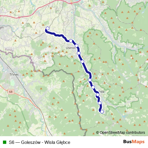 The first stop of the S6 rail route is Wisła Głębce and the last stop is Goleszów. S6 (Goleszów - Wisła Głębce) is operational during ежедневно.