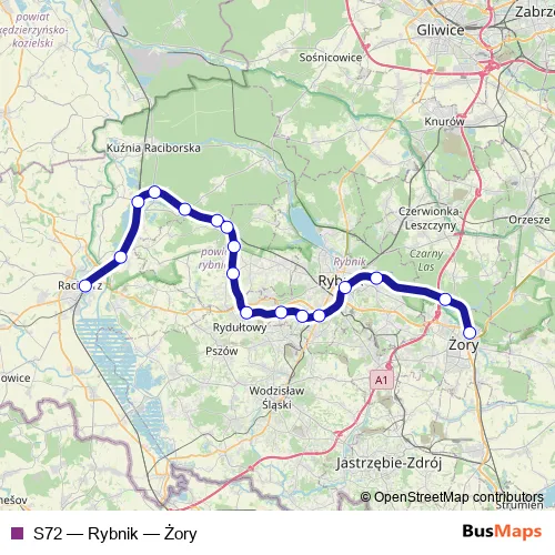 The first stop of the S72 rail route is Racibórz and the last stop is Żory. S72 (Rybnik — Żory) is operational during ежедневно.