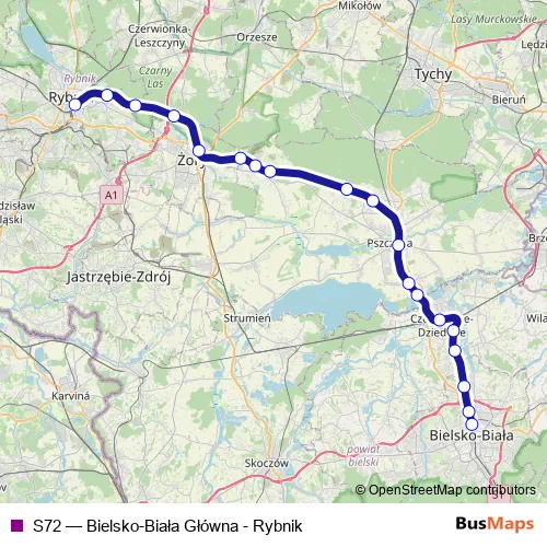 The first stop of the S72 rail route is Bielsko-Biała Gł. and the last stop is Rybnik. S72 (Bielsko-Biała Główna - Rybnik) is operational during ежедневно.
