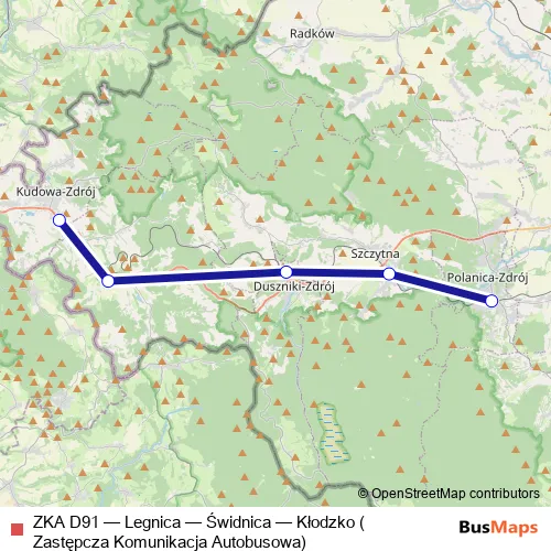 The first stop of the ZKA D91 bus route is Polanica Zdrój and the last stop is Kudowa-Zdrój. ZKA D91 (Legnica — Świdnica — Kłodzko (Zastępcza Komunikacja Autobusowa)) is operational during ежедневно.