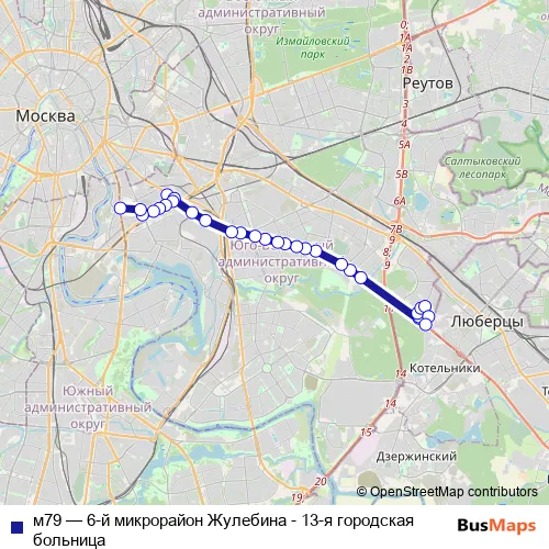 The first stop of the м79 bus route is 6-й микрорайон Жулебина and the last stop is Филиал больницы им. Демихова. м79 (6-й микрорайон Жулебина - 13-я городская больница) is operational during ежедневно.