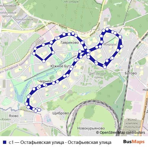 The first stop of the с1 bus route is Остафьевская улица and the last stop is Остафьевская улица. с1 (Остафьевская улица - Остафьевская улица) is operational during ежедневно.