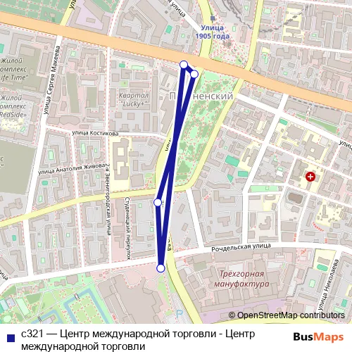 The first stop of the с321 bus route is Центр международной торговли and the last stop is Центр международной торговли. с321 (Центр международной торговли - Центр международной торговли) is operational during ежедневно.