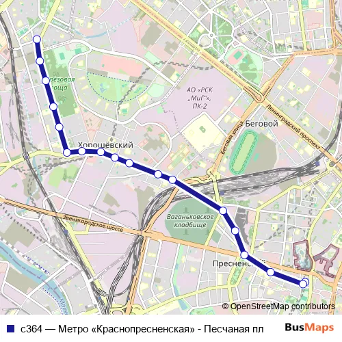 The first stop of the с364 bus route is Метро «Краснопресненская» and the last stop is Песчаная пл.. с364 (Метро «Краснопресненская» - Песчаная пл) is operational during ежедневно.